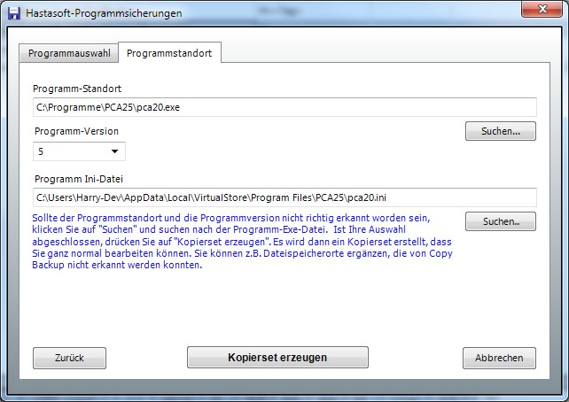 ![]() Hier können Sie kontrollieren, ob Copy Backup die Informationen richtig erkannt hat und bei Bedarf selber die Angaben ergänzen. Ein typsicher Fall könnte sein, wenn Sie das Programm nicht installiert, sondern einfach irgendwohin kopiert haben sollten und es dann so verwendet haben (aber das dürfte wohl eher der Ausnahmefall sein). Hier kann man erkennen, dass PC-Adreßzz! 5.x unter Vista oder einem neueren Windows-Betriebssystem verwendet wurde. Denn PC-Adreßzz! 5.x ist noch nicht für Vista oder neuer tauglich (erst ab PC-Adreßzz! 7.x). Daher wird die Ini-Datei (die Programmeinstellungs-Datei) nicht im Programmordner gespeichert, sondern in einem Virtualisierungsordner, den Windows anlegt, um zu verhindern, dass Programme Schreibvorgänge im Programmverzeichnis ausführen. Das passiert nicht nur mit der Ini-Datei. Wenn Sie also auch Ihre Adressdatei im Programmverzeichnis gespeichert haben, wird diese in Wahrheit ganz woanders gespeichert (obwohl es Ihnen so angezeigt wird). Wenn Sie hier nicht wissen, was zu sichern ist, dann droht Datenverlust. Die Verwendung von Copy Backup ist also insofern auch unbedingt Anwendern zu empfehlen, die noch mit älteren Programmversionen arbeiten (z.B. PC-Adreßzz! 6 oder älter) oder Programme, die noch dem Virtualisierungsmodus unterliegen (z.B. TimOnize 6 oder älter, PC-Notizz! 6 oder älter). |