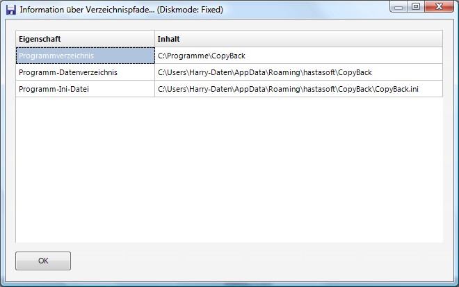 Menü Hilfe, Info über Verzeichnisse, zeigt Ihnen an, wo Copy Backup