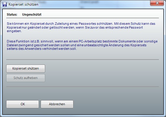 Mit diesem Dialog können Sie ein Kopierset schützen (z.B. vor dem